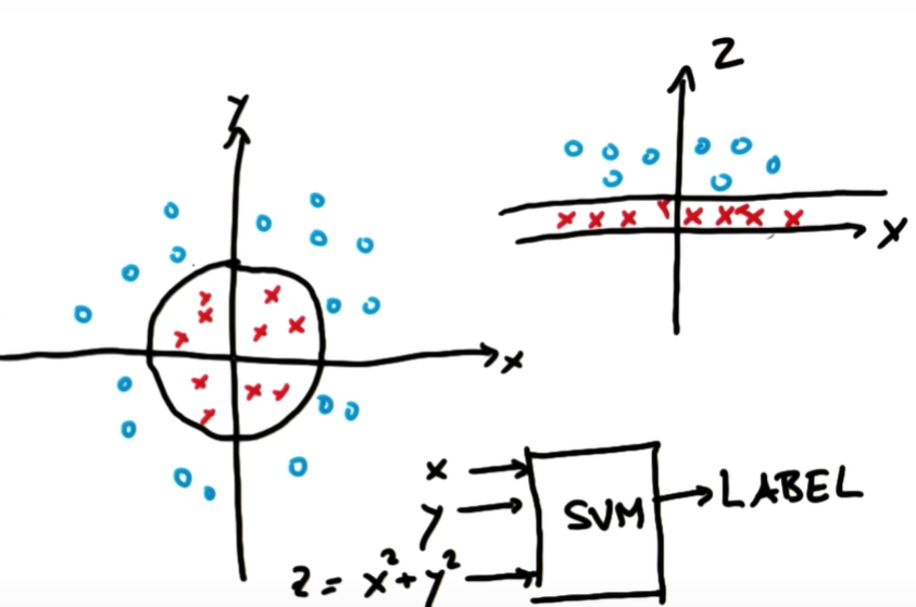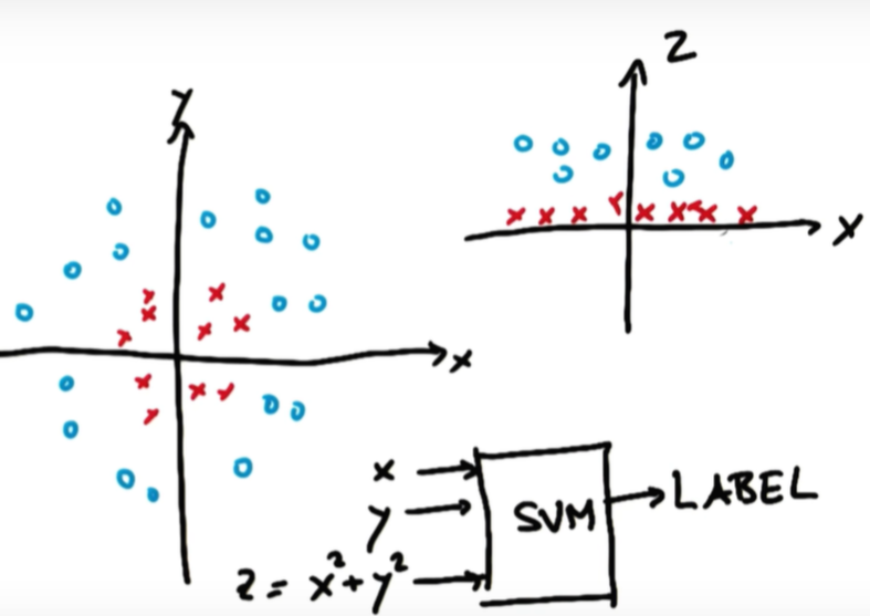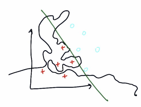 - 처음부터 저차원 공간에서 non linear separable line을 구하려면 쉽지 않음