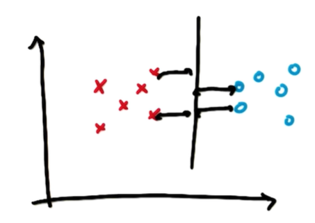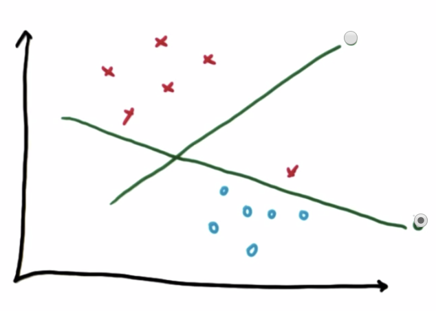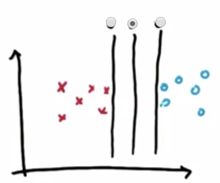 - 하지만 첫 번째 구분선은 데이터를 정확히 구분하지 못함 (하나의 데이터만 너무 멀리 떨어져있기 때문)