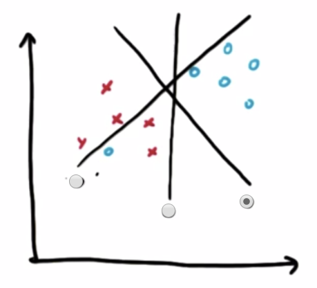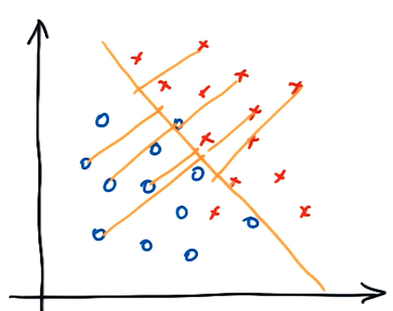 - 두 데이터를 정확히 구분하는 직선은 없음