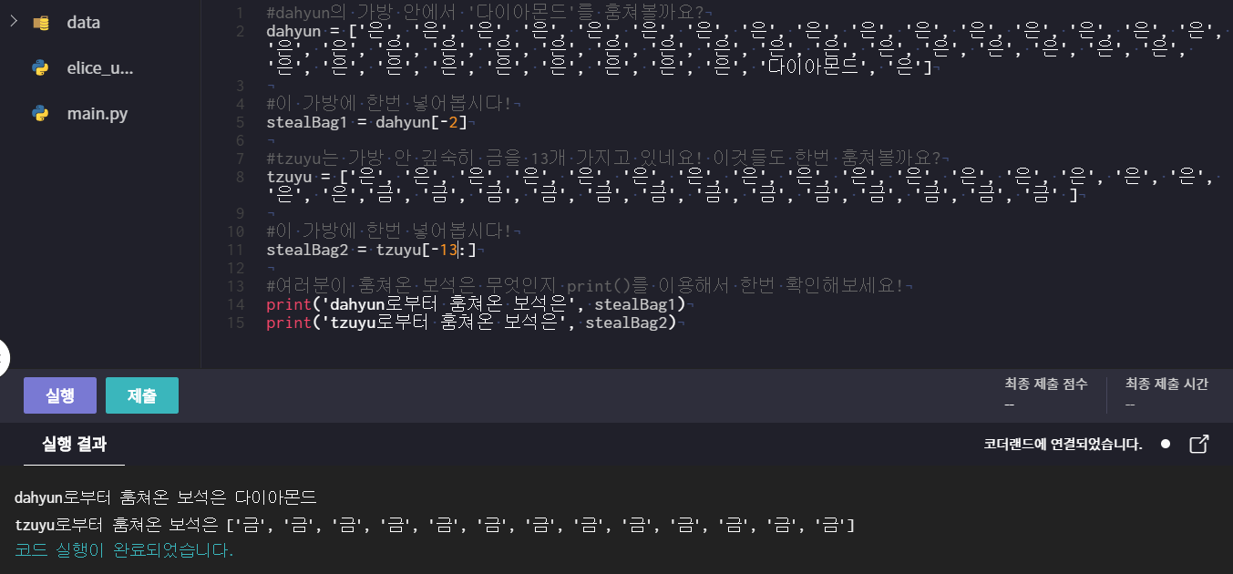 ex) a[-1] : 뒤에서 첫 번째 원소 / b[ : 3] : 맨 처음부터 세 번째 인덱스까지 슬라이싱