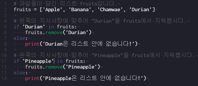 ice_cream = ["Mother is Alien", "Mint Choco", "NY Cheese Cake", "Mint Choco"] ice_cream.remove("Mint Choco") print(ice_cream) ## 실행 결과 ## ["Mother is Alien", "NY Cheese Cake", "Mint Choco"]
