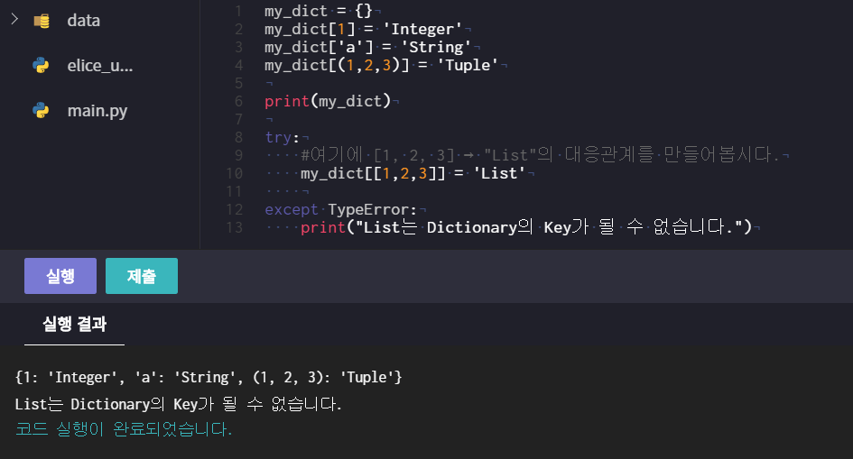 - 그러므로 list는 key가 될 수 없고 , tuple은 key가 될 수 있다