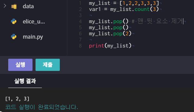 list.pop(i) : 인덱스 i의 원소를 제거 후 반환