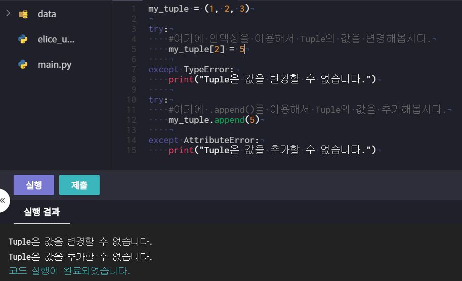 ★ Tuple은 자료가 추가, 삭제, 변경되지 않는다. 한 번 만들어지면 고정 됨!