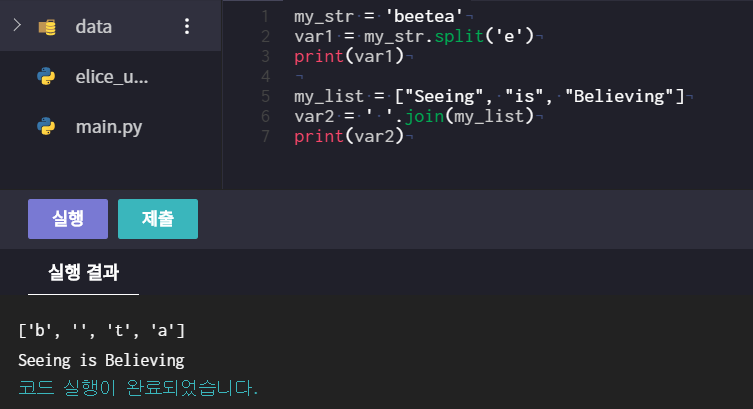 - str을 기준으로 리스트를 합쳐서 문자열을 반환 (괄호를 비울 시 공백)